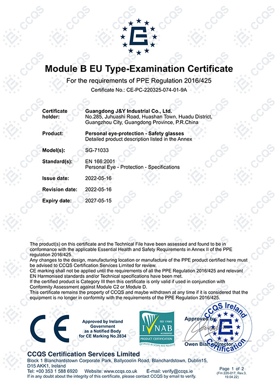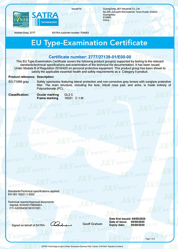 شهادة CE لنظارات السلامة SG-71072 وSG-71006BF
