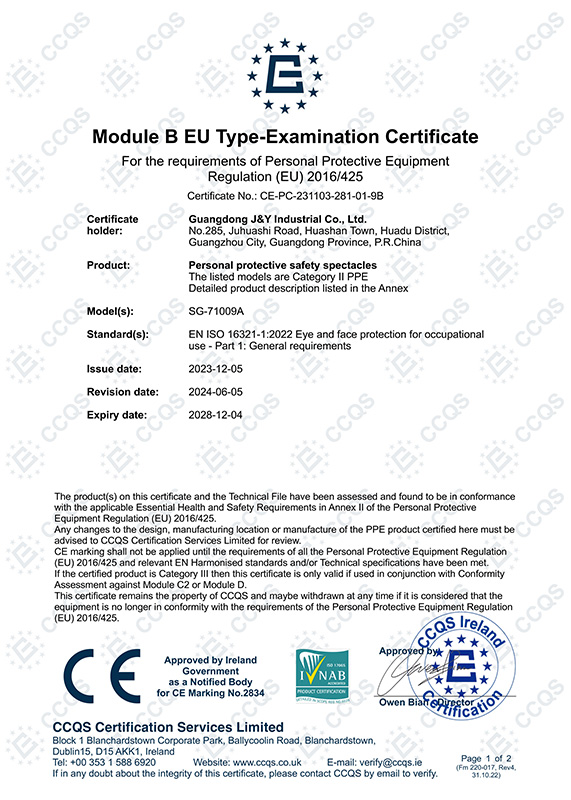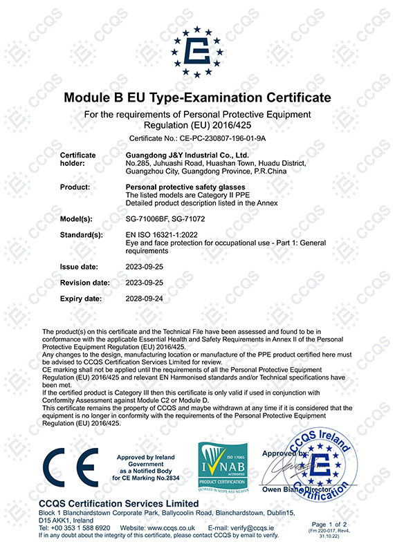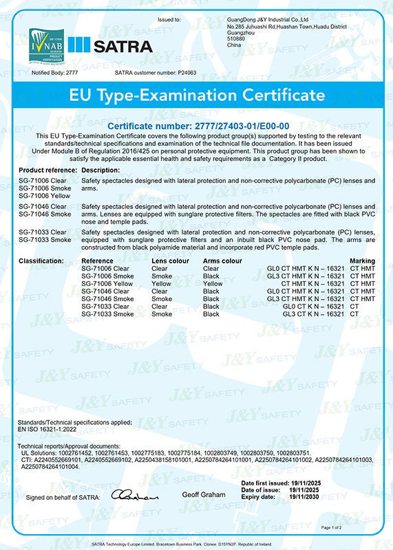 شهادة CE لنظارات السلامة SG-71072 وSG-71006BF